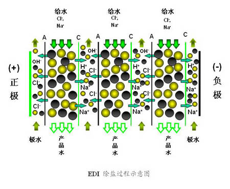 离子交换膜和离子交换树脂的工作原理相近,可以使特定的离子迁移。阴离子交换膜只允许阴离子通过,不允许阳离子通过;而阳离子交换膜正好相反。在-对阴阳离子交换膜之间充填混合离子交换树脂就形成一个EDI单元。阴阳离子交换膜之间由混合离子交换树脂占据的空间被称为淡水室。将定数量的EDI单元罗列在一起,使阴离子交换膜和阳离子交换膜交替排列,并使用网状物将每个EDI单元隔开形成浓水室。在给定的直流电压的推动下,在淡水室中,离子交换树脂中的阴阳离子分别在电场作用下向正负极迁移,并透过阴阳离子交换树脂进入浓水室,同时,给水中的离子被离子交换树脂吸附而占据由离子电迁移而流下的空位。事实上离子的迁移和吸附是同时并连续发生的。通过这样的过程,给水中的离子穿过离子交换膜进入到浓水室被去除而成为除盐水。
